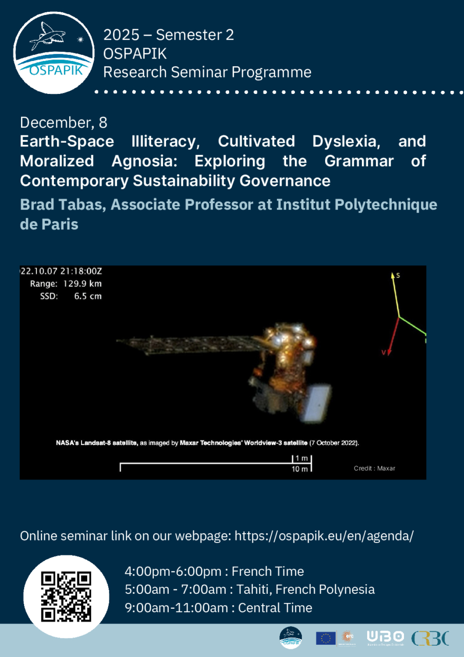 Séminaire de recherche OSPAPIK – Earth-Space Illiteracy, Cultivated Dyslexia, and Moralized Agnosia: Exploring the Grammar of Contemporary Sustainability Governance – Brad Tabas